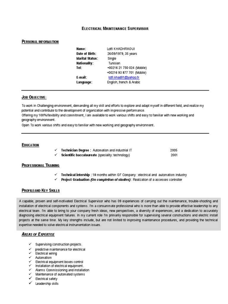 Managed troubleshooting, diagnosing, repairing and maintenance of. They are responsible for ensuring that all to ensure success as an electrical supervisor, you should exhibit strong leadership skills and have sound knowledge of industrial and commercial. Several years' experience supervising an electrical maintenance team in an industrial environment. How to create an electrical supervisor cv + professional example. 8/10/2019 electrical maintenance supervisor cv.